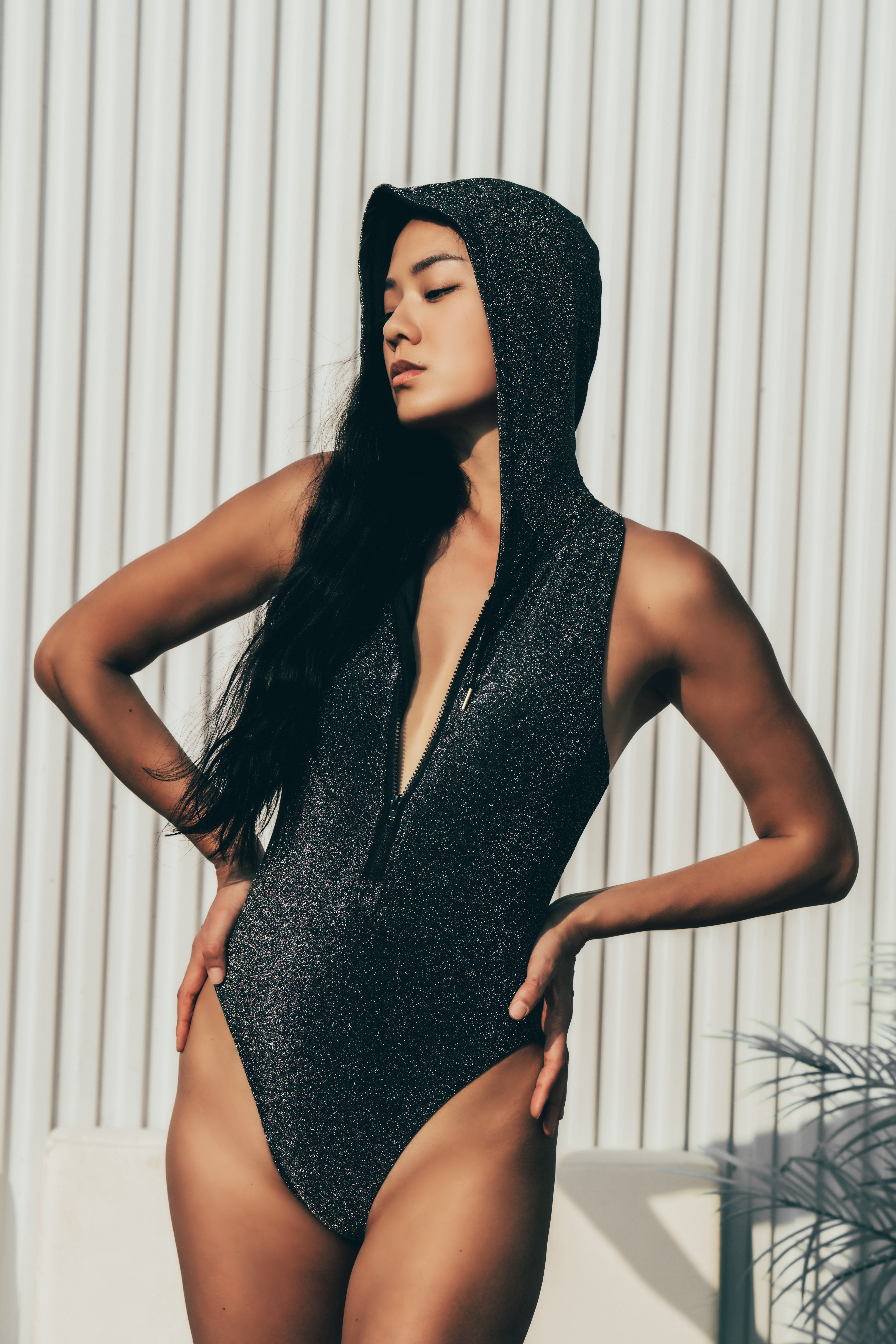 >市面少見的連帽泳衣 抽繩拉緊可當泳帽